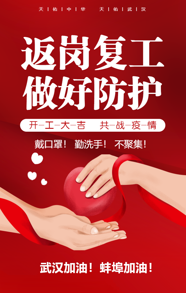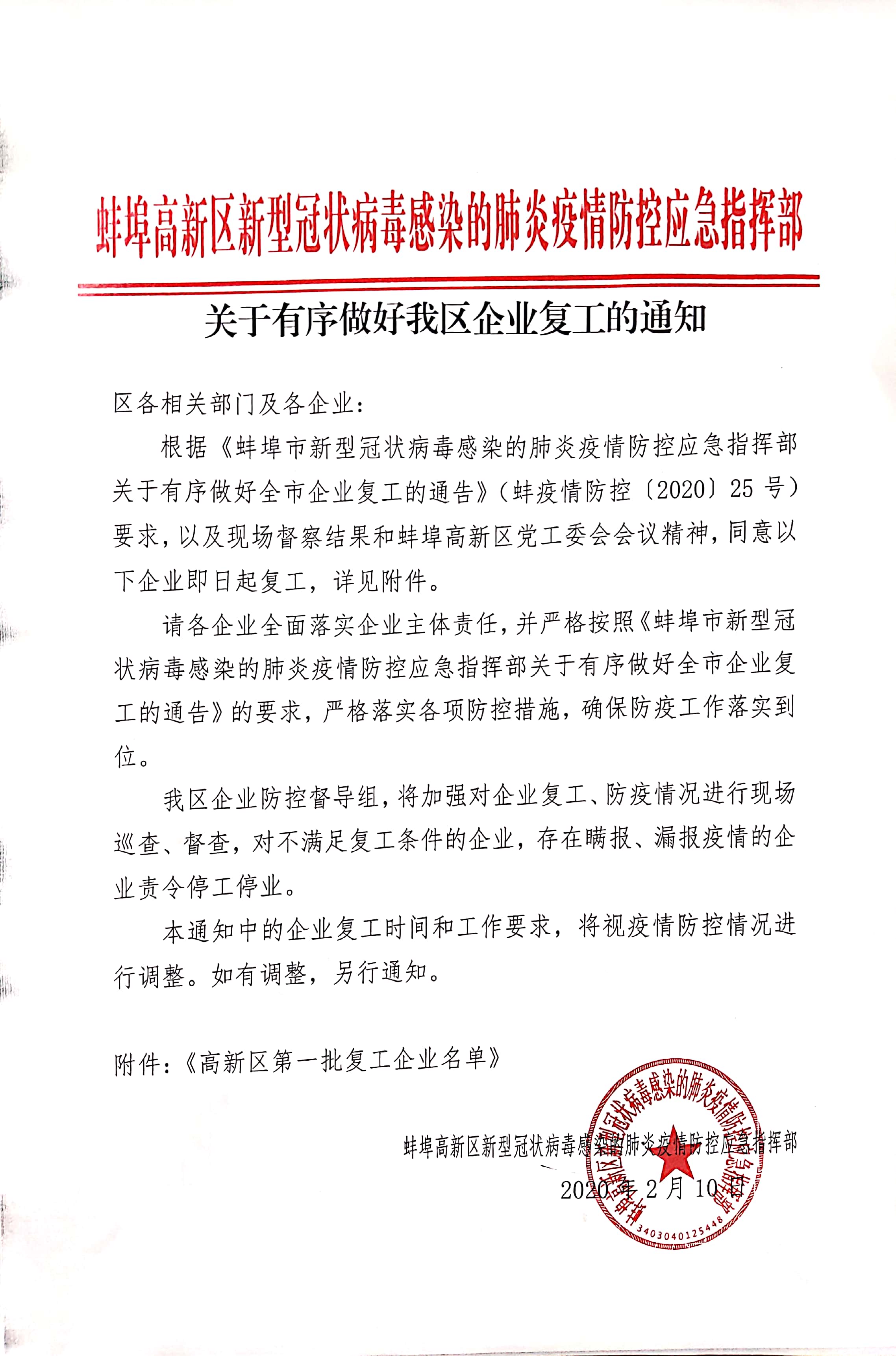 今天,依據相關精神和文件,雙環集團是首批獲得蚌埠市高新區同意復工的企業之一,這是政府對雙環的信任和支持,我們一定要加倍努力,克服困難,既要滿足客戶的需求,做好全面復工準備,也要做好防疫工作,兩方面都不能放松!我們要堅定樹立以客戶為中心,以奮斗者為本的雙環企業文化。不辜負客戶期望和政府的信任!為我國經濟發展,同時也要為完成2020年我公司制定的年度計劃努力奮斗!