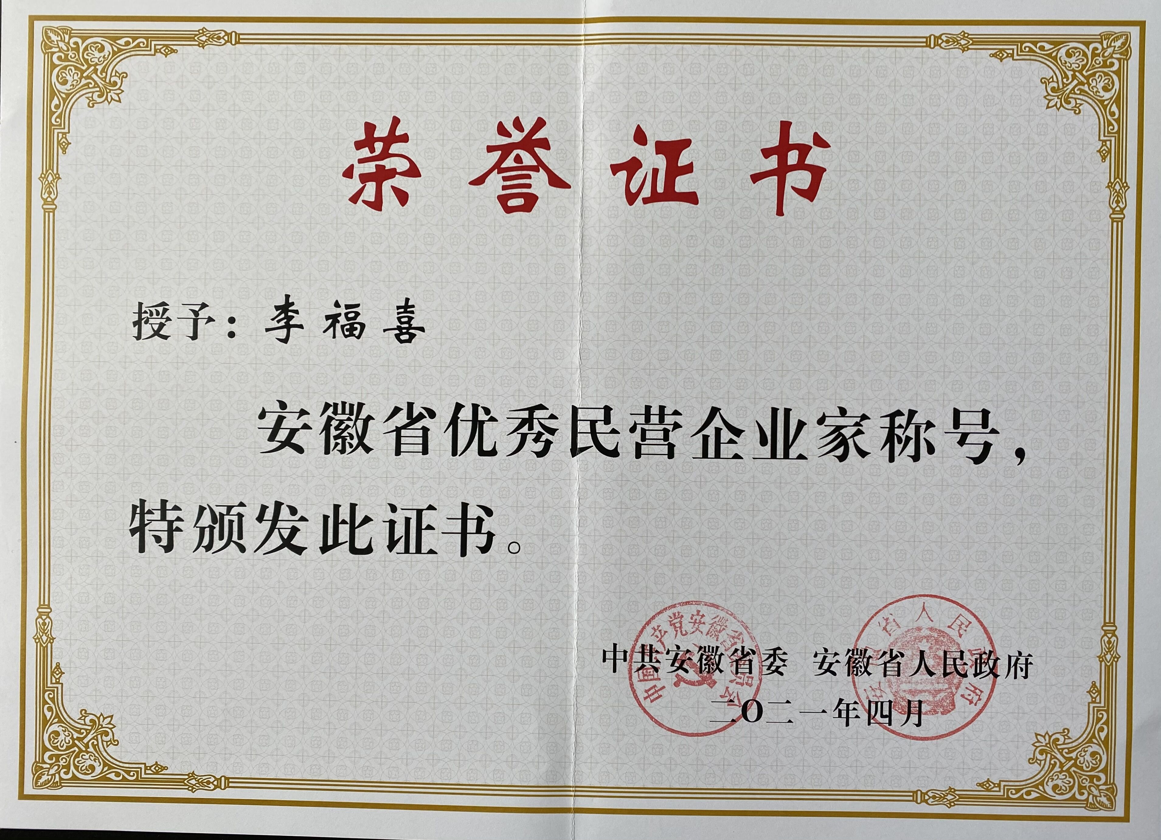 雙環集團李福喜董事長榮獲安徽省優秀民營企業家稱號