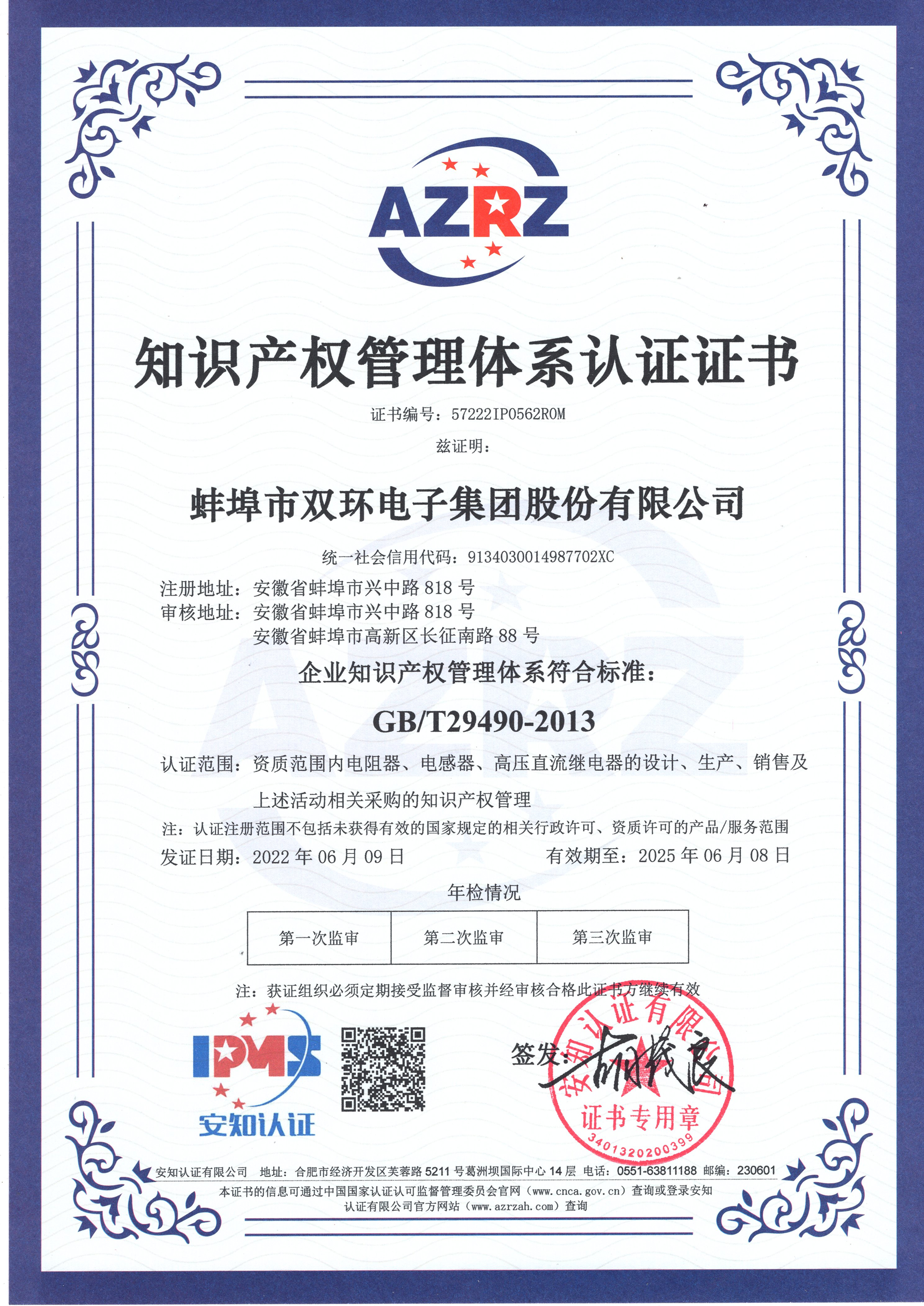 此次認證覆蓋了公司電阻器、電感器及高壓直流繼電器等所有產品。認證審核組專家通過抽樣檢查、詢問交流、收集材料等方式對公司各職能部門、生產單元進行了全面審核,對公司知識產權管理體系給予了公平公正的評價,肯定了體系運行中的優勢,指出了薄弱環節,最終表示:雙環集團的知識產權管理體系符合認證標準要求,同意推薦注冊發證。