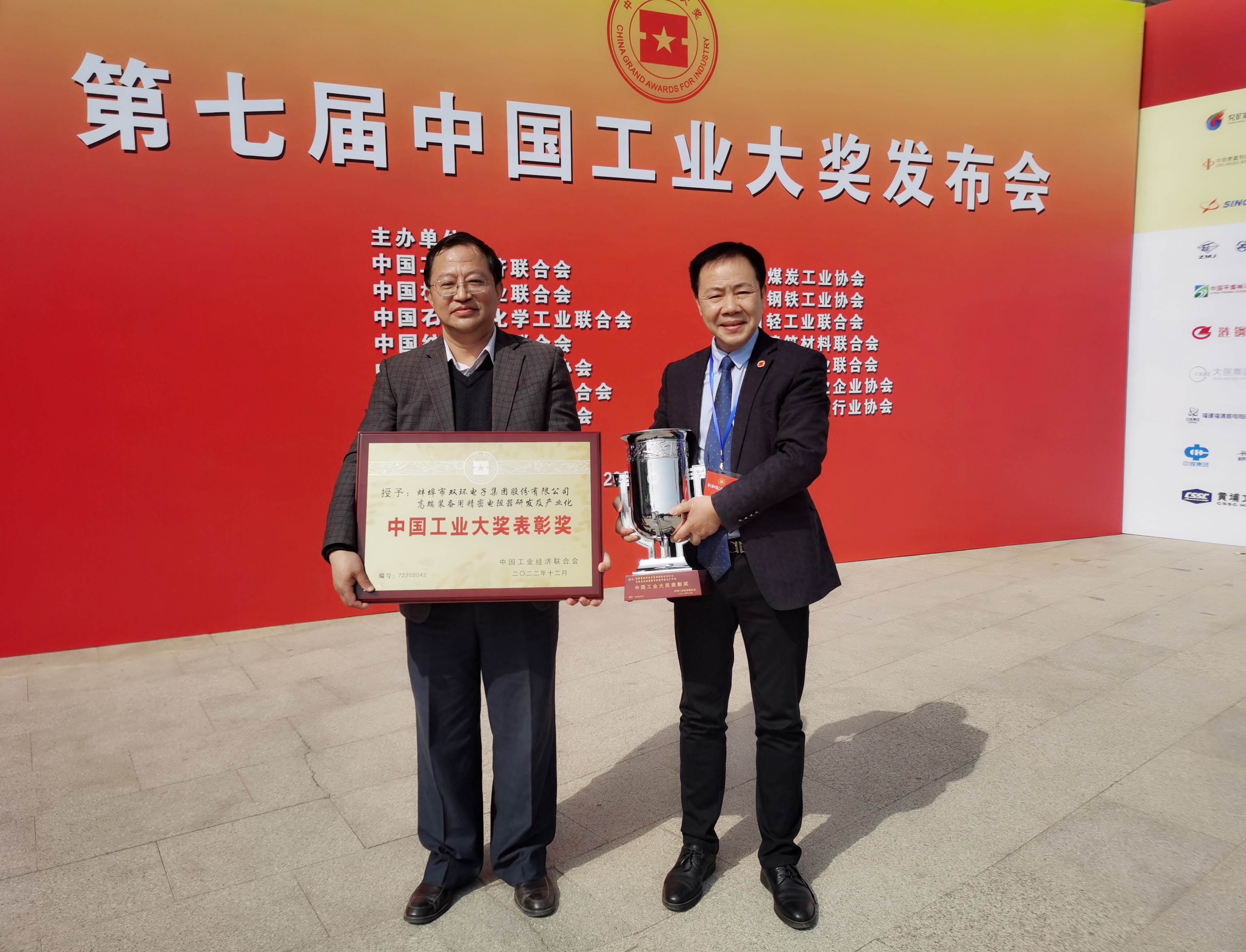 2023年3月19日,第七屆中國工業大獎發布會在北京友誼賓館隆重舉行。十屆人大常委會副委員會長顧秀蓮和國家相關部門領導出席發布會,獲獎企業負責人和全國各省市工經聯負責人參加了發布會。蚌埠市雙環電子集團股份有限公司董事長李福喜和副總經理邵建強作為項目獲獎單位代表受邀出席參加了大獎發布會。在會上發布的第七屆中國工業大獎獲獎名單中,雙環集團《高端裝備用精密電阻器研發及產業化》項目獲得中國工業大獎表彰獎。
